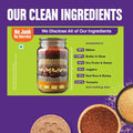 Whole Millet Flour 39% (Ragi/Naachni 22%, Little Millet/Saame 7%, Jowar 7%, Amaranth/Rajgira 3%), Powdered Dry Fruits & Seeds 16% (Dates 5%, Sunflower Seeds 5%, Almonds 3%, Cashews 3%), Butter 16%, Jaggery 15%, Barley 6%, Un-Polished Red Rice 6%, Ghee 1.99%, Turmeric 0.01% and nothing else